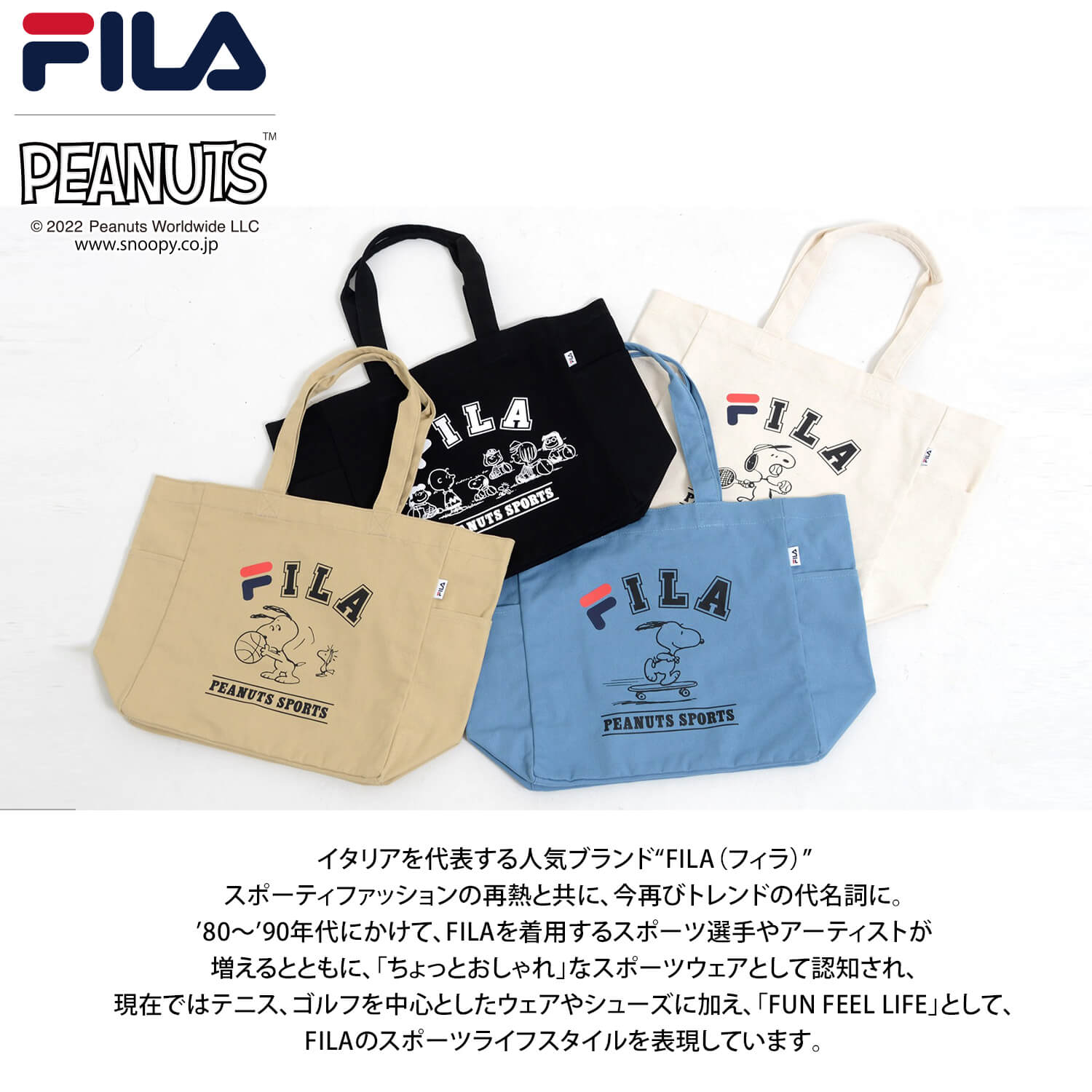FILA フィラ スヌーピー トートバッグ ショルダーバッグ レディース 大容量 27L 肩掛け キャンバス生地 綿 布 PEANUTS コラボ グッズ 大人 向け 女子 ブランド おしゃれ カジュアル かわいい エコバッグ 通学 通勤 旅行 黒 白 ベージュ ブルー 敬老の日 プレゼント