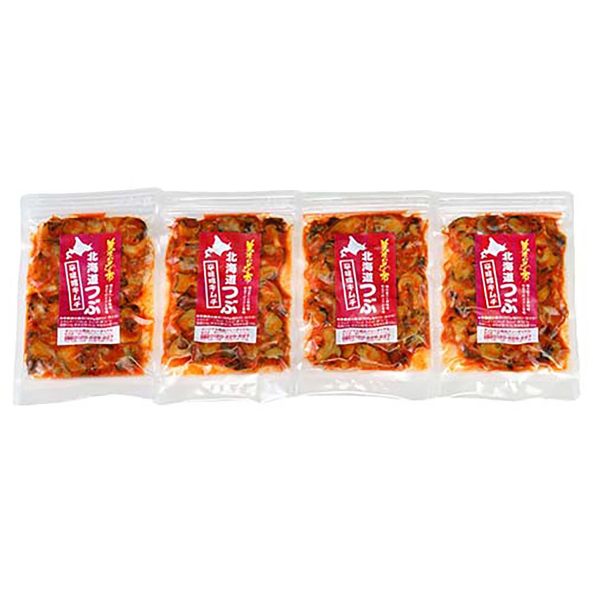 北海道の厳選したツブ貝とトップシェル(巻貝)をピリ辛で旨みのあるキムチダレに漬け込みました。